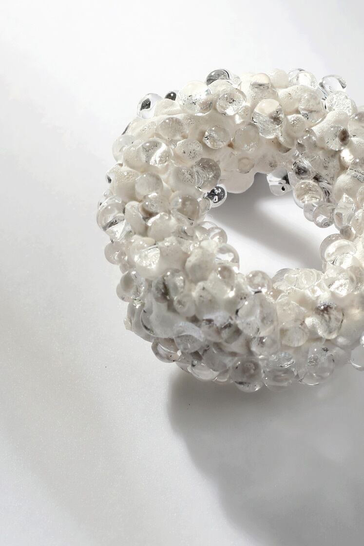 ボロシリケイトという耐熱ガラスを使用して制作しています。このガラスは非常に丈夫で軽く、透明度が高いという特徴があります。約2000℃のバーナーの炎でガラスを熱し、曲げたり熔かしたりして成形していきます。