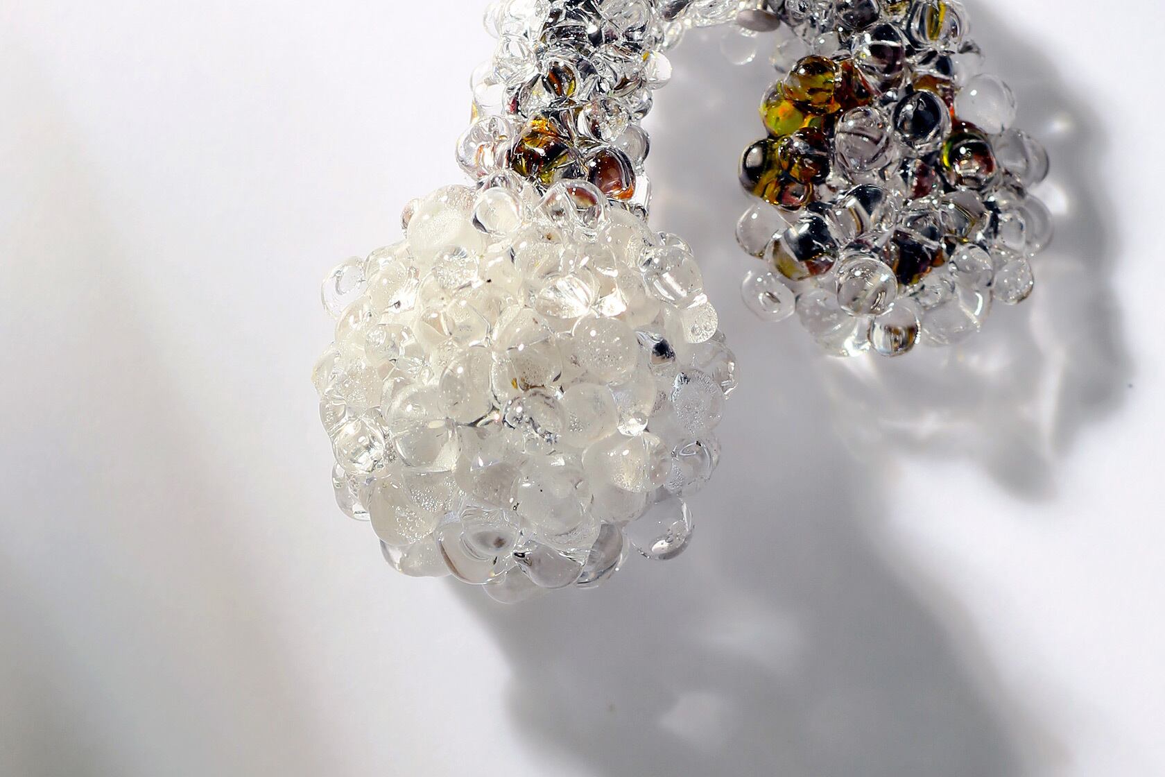 ボロシリケイトという耐熱ガラスを使用して制作しています。このガラスは非常に丈夫で軽く、透明度が高いという特徴があります。約2000℃のバーナーの炎でガラスを熱し、曲げたり熔かしたりして成形していきます。