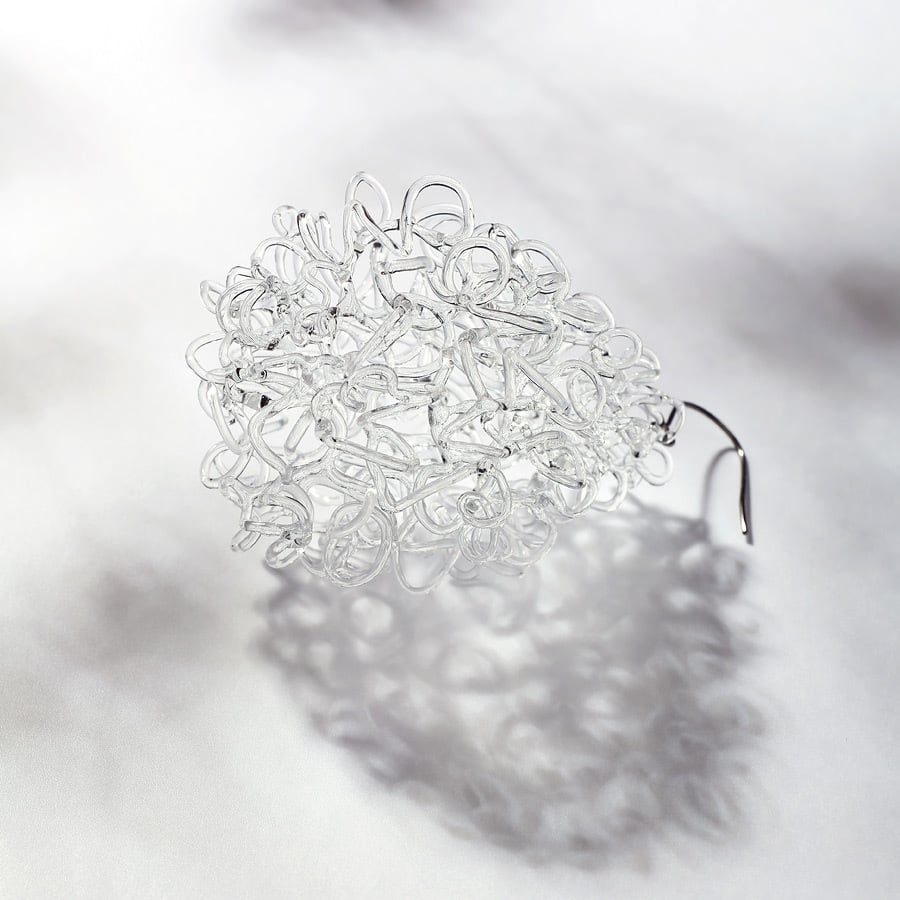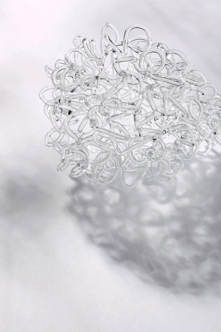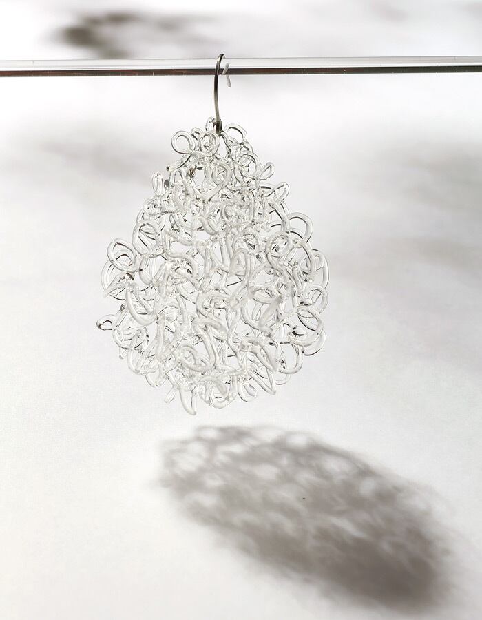 ボロシリケイトという耐熱ガラスを使用して制作しています。このガラスは非常に丈夫で軽く、透明度が高いという特徴があります。約2000℃のバーナーの炎でガラスを熱し、曲げたり熔かしたりして成形しています。